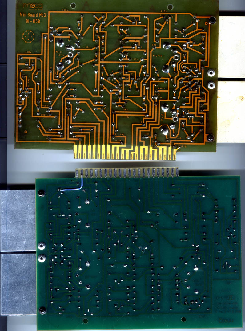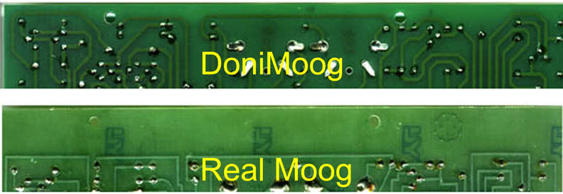 Additionally, as can be seen by the power supply boards, the DoniMoogs edge card fingers are only half as long as a real Moog's.