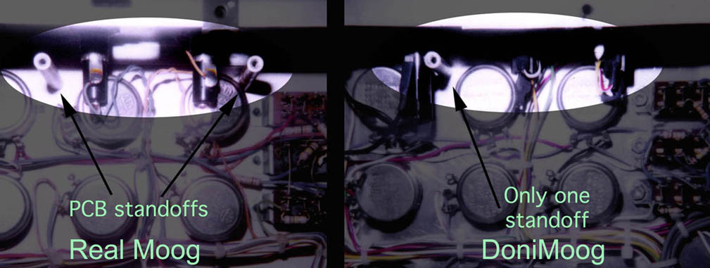With a DoniMoog, the edge card fingers are of a poorer resistive contact, make a less firm contact with their edge connectors and finally, the case flexes enough to easily dislodge the PCB's.