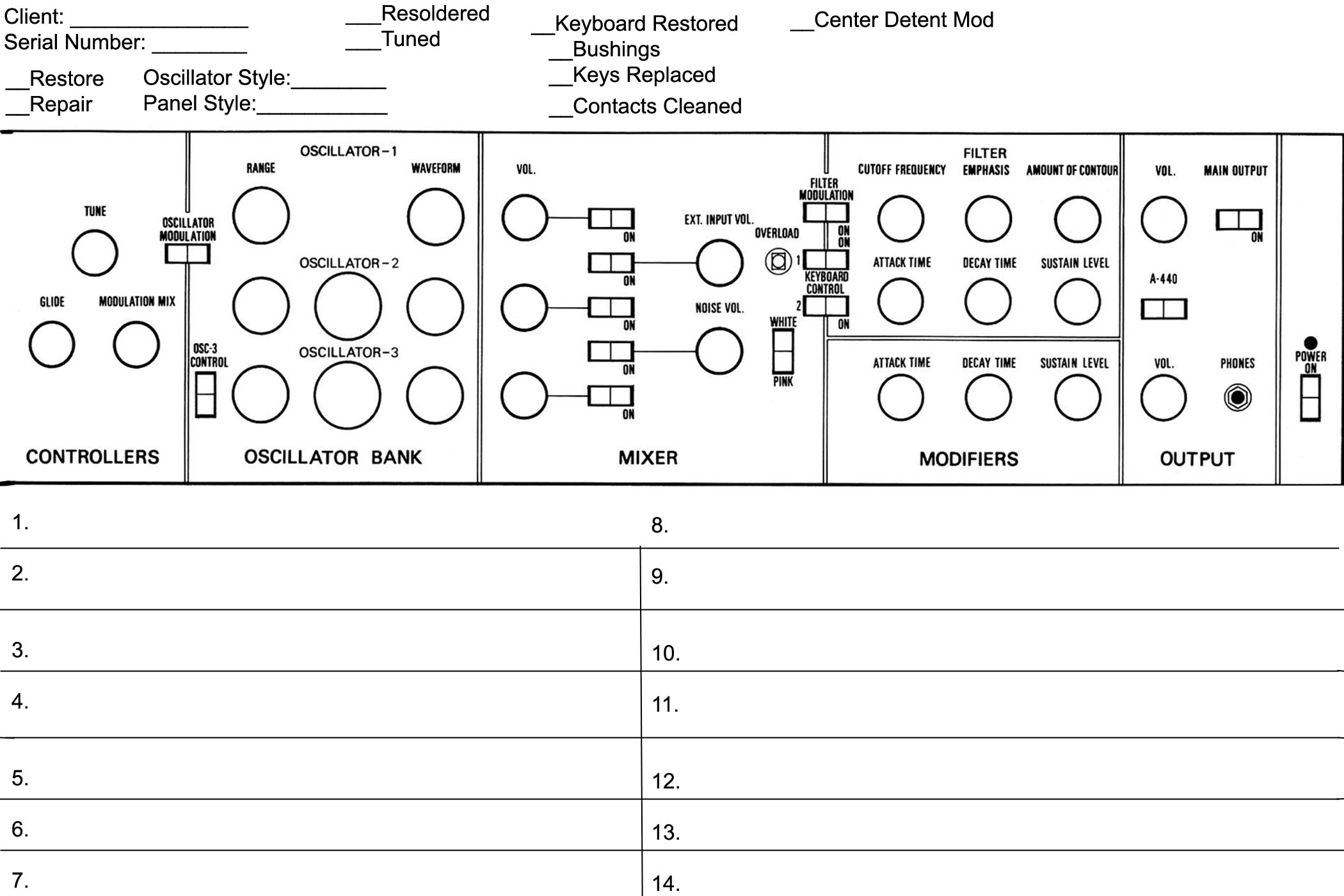 In 2015, Moog asked Kevin's estate for any notes and documentation I could find of Kevin's for their upcoming reissue of the Minimoog Model D. I wanted to make sure this reissue would be successful, so I donated the following files. All personal information has been removed.